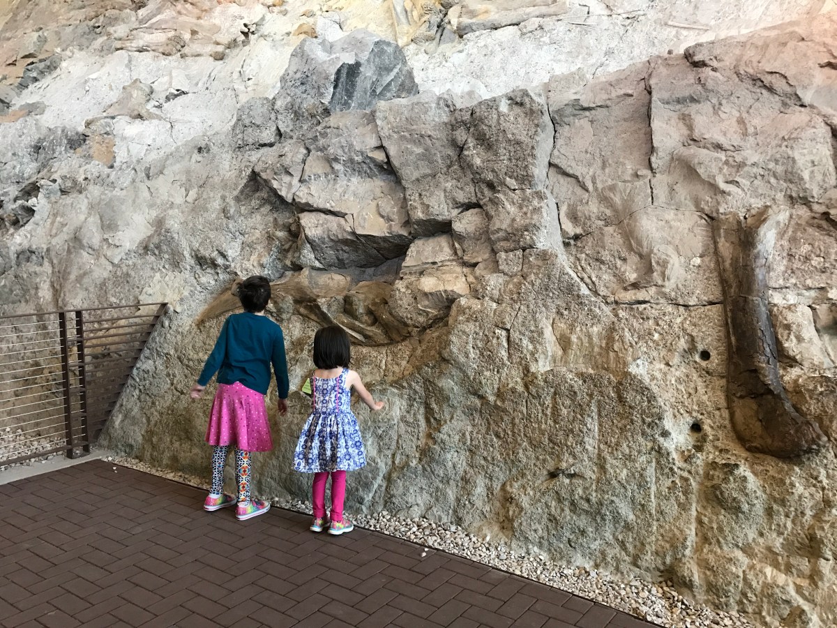 The Quarry is on the Utah side. It has some great specimens displayed in cases, a selection of historical photos (my favorite is the girl in pigtails), but the big attraction is the wall of fossils embedded in sedimentary rock.